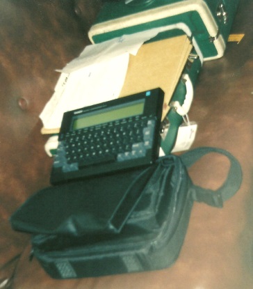 God told me to put this information into a book, so I started writing it in late 1991, and on January 20, 1992, the book was completed. To write the book I used new and emerging computer technology. Although computer word processing had been around for about eight years by that time, most computers were bulky desk top units. However, there was a new dedicated word processor, like a laptop but only for word processing and nothing else. I used this dedicated word processor because it was portable. At that time I was employed as a security guard, and my employer permitted me to write the book while I was at work. The following picture is of that dedicated word processor plus the suitcases that I used to transport my notes from my home to my employment and back: