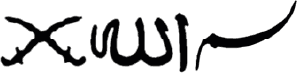 This Arabic text above means "in the name of Allah" with crossed swords depicting military conquest through jihad (Arabic word for holy war). This looks a lot like the original text from the Book of Revelation shown here: