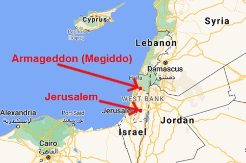 Armageddon is between the Mediterranean Sea and the Sea of Galilee: